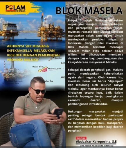 Direktur Polam-Indonesia, Maluku, Abubakar Karepesina, SE, menegaskan pentingnya dukungan masyarakat Maluku terhadap pengembangan Proyek Strategis Nasional (PSN) di sektor minyak dan gas, khususnya proyek Blok Masela. Proyek ini menjadi salah satu fokus utama pemerintah pusat dalam upaya meningkatkan produksi energi nasional.