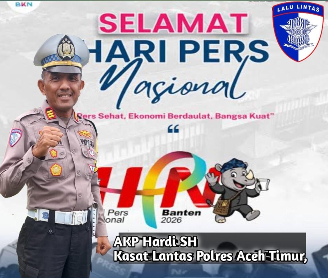 Kasat Lantas Polres Aceh Timur AKP Hardi beserta seluruh jajaran Personel Polantas Polres Aceh Timur mengucapkan selamat hari pers Nasional (HPN) 2026 ke-80 kepada seluruh wartawan khususnya di kabupaten Aceh Timur.ujar AKP Hardi melalui pesan WhatsApp Kepada media ini.Senin (9/2/2026).