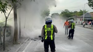 Mediaistana.com||GRESIK – Respons cepat ditunjukkan jajaran Satuan Lalu Lintas (Satlantas) Polres Gresik saat membantu memadamkan kebakaran sepeda motor di depan pintu keluar Terminal Bunder, Selasa (31/3/2026) sekitar pukul 16.09 WIB.