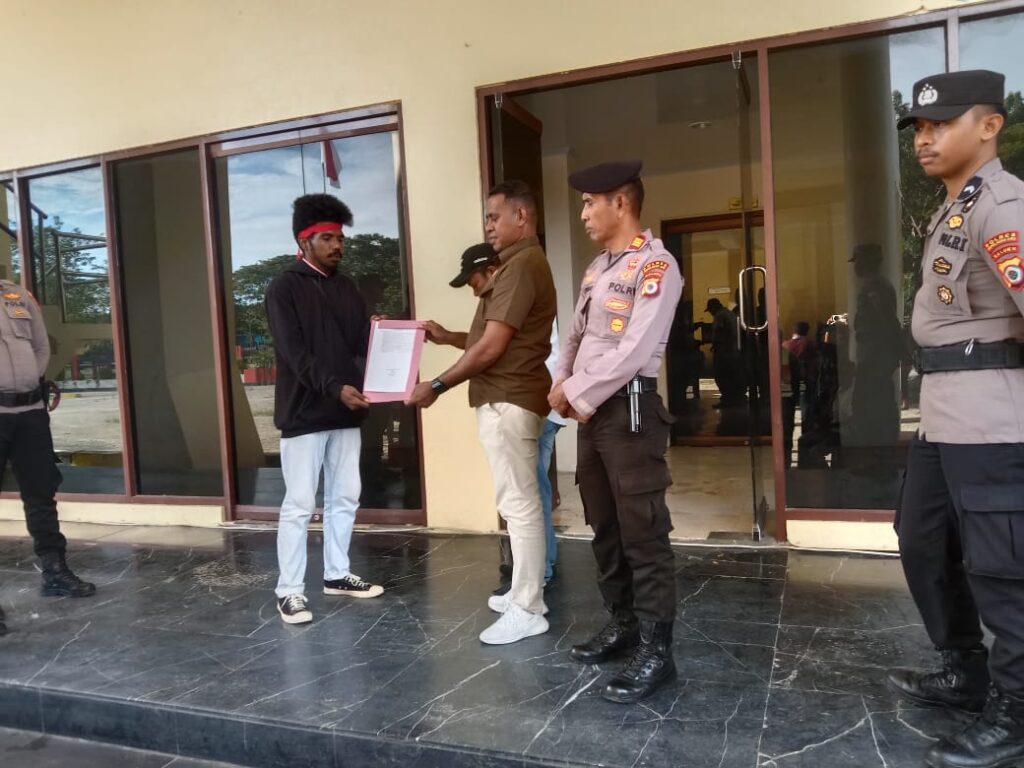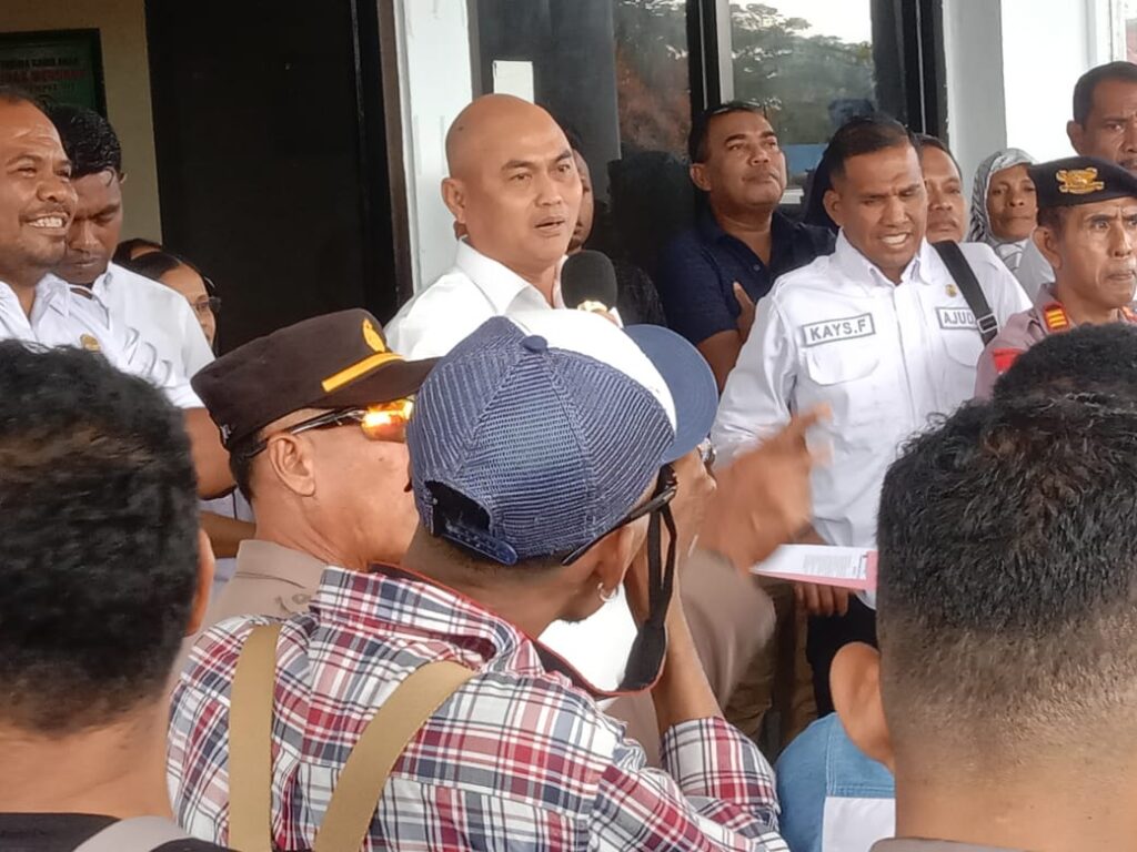 Di depan Kantor Bupati, para mahasiswa dan pemuda menyampaikan orasi secara bergantian, menuntut Bupati Aru Timotius Kaidel dan Wakil Bupati Drs. Mohamad Djumpah, M.Si, untuk menemui mereka dan menanggapi delapan poin tuntutan yang tertuang dalam pernyataan sikap. Bupati Kaidel, didampingi beberapa pejabat daerah, kemudian keluar untuk menerima pernyataan sikap tersebut.