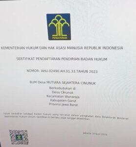 Hal senada disampaikan Sekertaris Desa Cinunuk Raden Firman, B.Z., S.Hut didampingi Kaur Keuangan Edi Juanda, menjelaskan Badan Usah Milik Desa (BUMDes) Mutiara Sejahtera Cinunuk, telah berbadan hukum Nomor : AHU-02490.AH.01.33.TAHUN 2023. Beralamat di Jln Pangeran Papak 134 Desa Cinunuk, Kecamatan Wanaraja, Kabupaten Garut.