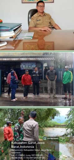 Garut – mediaistana.com. Camat Banyuresmi bersama Kepala Desa Sukaratu terjun langsung monitoring situasi dan kondisi banjir di wilayah Desa Sukaratu, Kecamatan Banyuresmi, Kabupaten Garut – Jawa Barat. Sabtu, 28 Juni 2025.