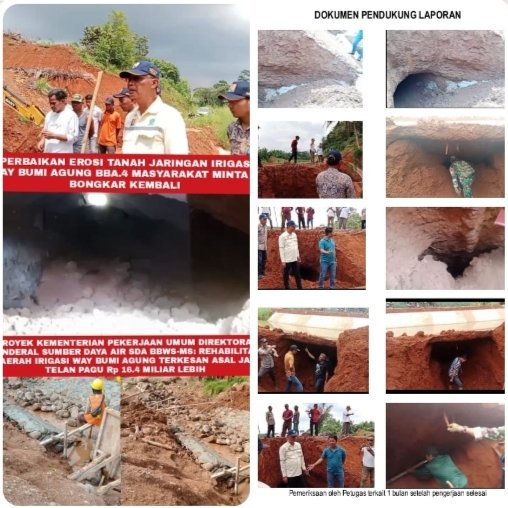 Sementara dikesempatan yang sama Mitah selaku pengawas lapangan dari kontraktor PT Bajasa Menunggal Sejati (BMS), saat di konfirmasi membenarkan atas erosi tanah jaringan irigasi way bumi agung.