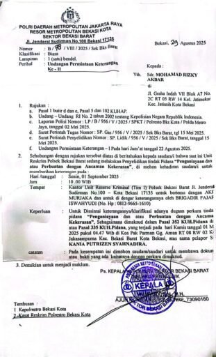 Sebelumnya Polisi telah menertibkan surat pemanggilan dengan register Surat Perintah Penyelidikan (SP.Lidik) Nomor: SP.Lidik/956/V/2025/Sek Bks Barat. Namun terduga pelaku berinisial MRA di kabarkan mangkir dari pemanggilan tersebut.