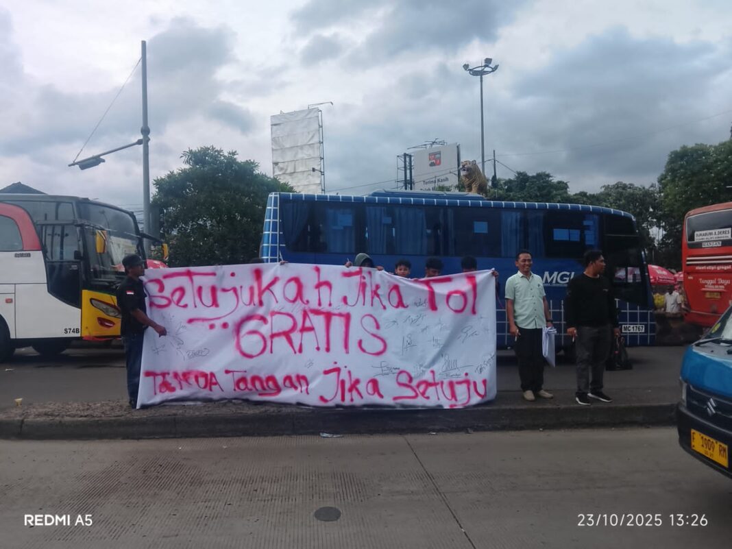 |Bogor Raya 23 Oktober 2025| Puluhan massa dan mahasiswa yang tergabung, menggelar aksi “Garatiskan Jalan Tol” di depan pintu Tol Ciawi Bogor, pada Kamis 23 Oktober 2025. Aksi ini merupakan bentuk protes tentang despotik pemerintah terhadap rakyat, dengan konsensi yang dinilai tidak berpihak kepada masyarakat.