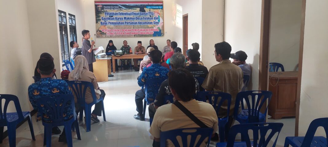 Ngawi – Gabungan Kelompok Tani (Gapoktan) Karya Makmur Desa Tulakan bekerja sama dengan Balai Penyuluhan Pertanian (BPP) Kecamatan Sine kembali menyelenggarakan Pelatihan Teknologi Tepat Guna (TTG) sebagai program tahunan. Kegiatan dilaksanakan di Gedung Pertemuan Kantor Desa Tulakan dan diikuti perwakilan sembilan kelompok tani dari seluruh desa setempat.