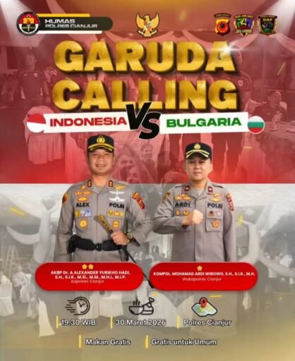 Cianjur, Minggu 29 Maret 2026 — Dalam rangka mendukung perjuangan Tim Nasional Indonesia di kancah internasional, Polres Cianjur menggelar kegiatan nonton bareng (nobar) pertandingan sepak bola antara Timnas Indonesia melawan Bulgaria.