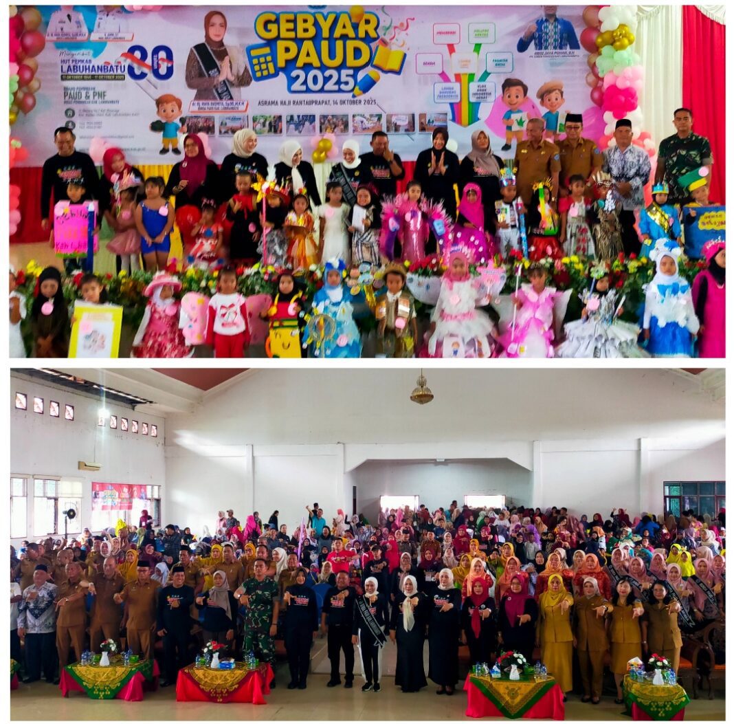 Hal tersebut disampaikan Bunda Maya Hasmita saat membuka Gebyar PAUD dalam rangka memperingati Hari Jadi ke-80 Kabupaten Labuhanbatu, yang digelar di Asrama Haji Rantauprapat, Kelurahan Ujung Bandar, Kecamatan Rantau Selatan, Selasa (14/10/2025).