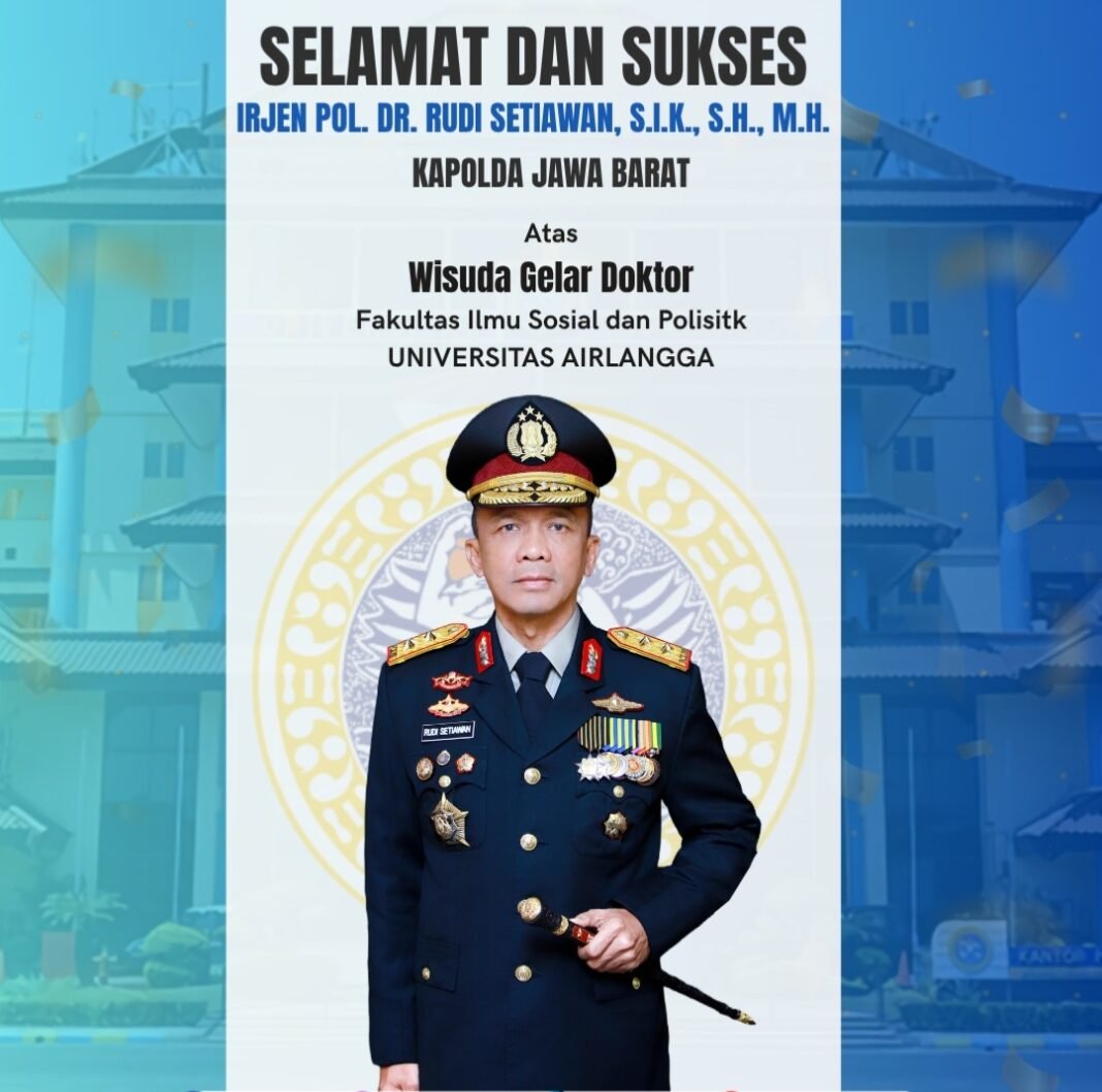 Surabaya, 11 April 2026 – Kabar membanggakan datang dari jajaran Kepolisian Republik Indonesia. IRJEN POL. Dr. Rudi Setiawan, S.I.K., S.H., M.H. resmi menyandang gelar Doktor setelah mengikuti prosesi wisuda pada Fakultas Ilmu Sosial dan Ilmu Politik Universitas Airlangga.