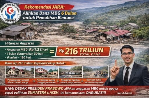 “Ini bukan tentang menolak program MBG, tetapi soal penyesuaian prioritas dalam situasi darurat nasional. Rakyat yang jadi korban banjir bandang membutuhkan tindakan pemulihan cepat. Anggaran sebesar Rp 216 triliun dari realokasi MBG selama enam bulan dapat menjadi kekuatan besar untuk membangun kembali rumah, jembatan, sekolah, hingga pemulihan ekonomi masyarakat,” ujar Nuzulul Azmi dari JARA.