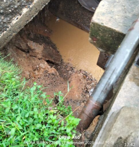 Akibat terjangan air yang terlalu deras hingga mengakibatkan terjadinya longsor di ujung jembatan dan terjadi lobang besar sedalam 5 meter yang mengancam putusnya jembatan, Rabu 3 Desember 2025.