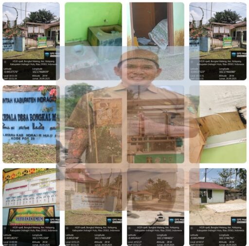Khusus salah satu kantor desa Indragiri hulu, tepatnya desa bongkal malang kecamatan Kelayang, kabupaten Inhu, yang sama sekali dugaan tidak pernah direhab ,tampak dari luar kantor, desa bongkal malang kumuh, berdebu, plafon bolong, plang merek kantor desa kumuh , sepertinya kantor desa udah lama ditinggal dan udah lama tidak berpenghuni, kamis 25/9/2025.