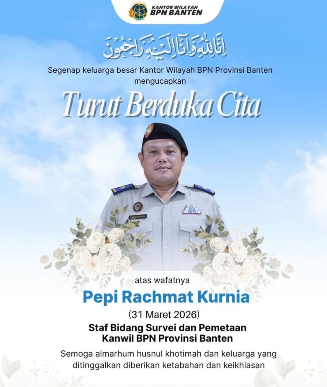 Serang, 31 Maret 2026 – Keluarga besar Kantor Wilayah Badan Pertanahan Nasional (BPN) Provinsi Banten menyampaikan duka cita yang mendalam atas wafatnya Bapak Pepi Rachmat Kurnia, staf pada Bidang Survei dan Pemetaan Kanwil BPN Provinsi Banten.