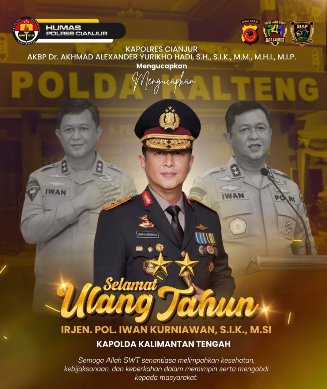 Cianjur, Kamis, 2 April 2026 – Kepala Kepolisian Resor (Kapolres) Cianjur, AKBP Dr. A. Alexander Yurikho Hadi, S.H., S.I.K., M.Si., M.M., M.H.I., M.I.P., beserta seluruh jajaran dan keluarga besar Polres Cianjur menyampaikan ucapan selamat ulang tahun kepada Inspektur Jenderal Polisi (Irjen Pol.) Iwan Kurniawan, S.I.K., M.Si., yang saat ini menjabat sebagai Kepala Kepolisian Daerah (Kapolda) Kalimantan Tengah.