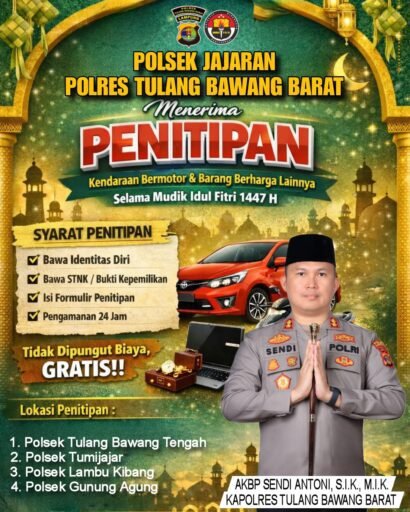 “Kami mengimbau sekaligus memberikan informasi kepada masyarakat atau pemudik yang ingin menitipkan kendaraan bermotor di Polsek dipersilakan,” ujar Kapolres Tubaba AKBP Sendi Antoni, Minggu (15/03/2026)