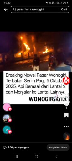 Kondisi memprihatinkan terjadi di pasar Wonogiri ,Senin pagi dini hari telah terjadi kebakaran dipasar kota wonogiri .api melahap tiap tiap toko dan Lospasar yang berada didalam pasar ,pedagang mengeluh karena kerugian yang besar banyak para pedagang mengalami kerugian yang cukup besar ,salah satunya pegangang dengan nama yulianto  yulianto mengaku barang sembako ditokonya mencapai kisaran 250 jt jika ditotal dengan piutang piutang sembako yang belum kebayar bisa mencapai 400 an jt rupiah…ditengah kondisi perekonomian yang lesu dan sepi kenapa harus terjadi musibah kebakaran ini yang dikeluhkan oleh salah satu pedagang yang tokonya dan dagangannya habis di lalap sijago merah