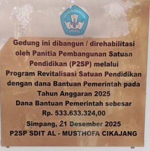 Garut, mediaistana.com – Tiga sarana dan prasarana Sekolah Dasar Islam Terpadu (SD IT) Al Musthofa Cikajang, selesai dibangun pada akhir Tahun 2025, bertempat di Jln. Simpang Cikandang KM. 93, Desa Simpang, Kecamatan Cikajang, Kabupaten Garut. Minggu (1/03/2026).