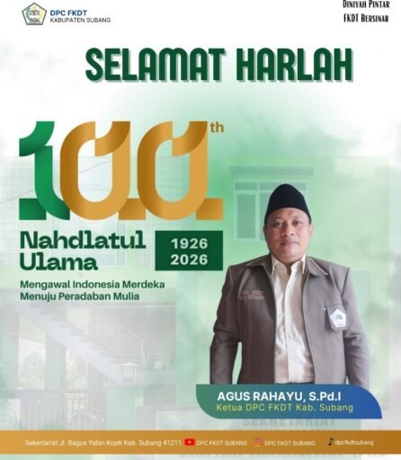 Ketua Forum Komunikasi Diniyyah dan Takmilliyah (FKDT) kabupaten Subang H.Agus Rahayu S.Pd.i mengucapkan”Selamat Hari Lahir Nahdlatul Ulama (NU) yang ke-100 atau satu abad.