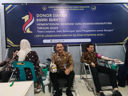 Banda Aceh Dalam rangka memperingati Hari Bakti Kementerian Imigrasi dan Pemasyarakatan Ke-1 Tahun 2025, Kantor Wilayah Direktorat Jenderal Pemasyarakatan Aceh menyelenggarakan rangkaian kegiatan sosial secara bersamaan, yang meliputi Donor Darah,Pengobatan Gratis, dan Bakti Sosial. Seluruh kegiatan berlangsung di lingkungan Rutan Kelas IIB Banda Aceh, Jumat (14/11/2025).