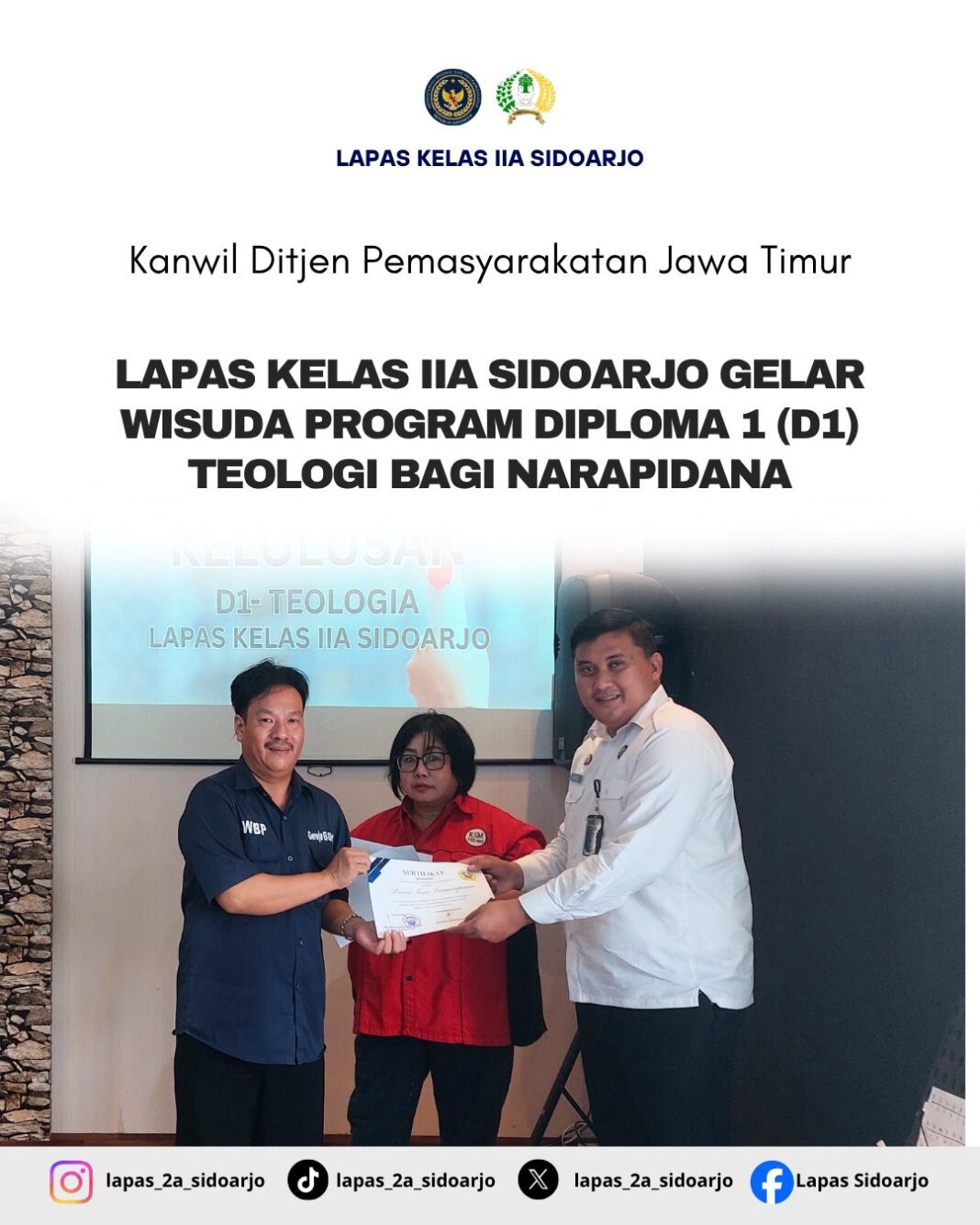 Pemerintah,Sidoarjo||Mediaistana.com -Lembaga Pemasyarakatan (Lapas) Kelas IIA Sidoarjo menyelenggarakan kegiatan Wisuda Program Diploma 1 (D1) Teologi bagi narapidana sebagai bagian dari program pembinaan kerohanian dan pendidikan formal di lingkungan pemasyarakatan. Acara wisuda ini berlangsung pada Senin, 6 Oktober 2025 pukul 09.00 hingga 11.00 WIB bertempat di Gereja El-Shaddai Lapas Kelas IIA Sidoarjo.