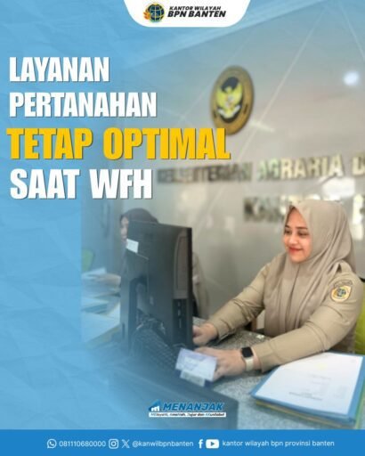 Serang, 14 April 2026 – Menindaklanjuti arahan kebijakan bekerja dari rumah (work from home/WFH) setiap hari Jumat sesuai dengan Surat Edaran Sekretaris Jenderal Kementerian Agraria dan Tata Ruang/Badan Pertanahan Nasional (ATR/BPN) Nomor B/TU.03/400/IV/2026, Kantor Wilayah BPN Provinsi Banten memastikan bahwa layanan pertanahan pada Kantor Pertanahan di seluruh wilayah tetap berjalan secara optimal.