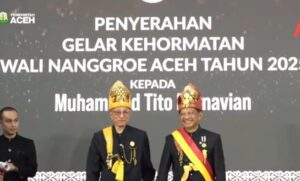 Menteri Dalam Negeri (Mendagri) Muhammad Tito Karnavian resmi menerima medali, Kehormatan serta gelar Petua Panglima Hukom Nanggroe dari Wali Nanggroe Aceh, Paduka Yang Mulia,Teungku Malik Mahmud Al-Haythar.