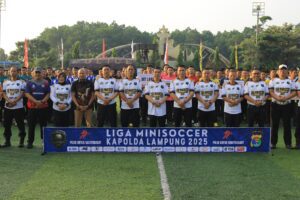 Lampung – Polda Lampung gelar Liga Minisoccer Piala Kapolda Cup 2025 sebagai rangkaian tahunan Hari Bhayangkara Ke-79, Suasana meriah dan penuh semangat menyelimuti Lapangan minisoccer Presisi Polda Lampung. Jumat (4/7/25)