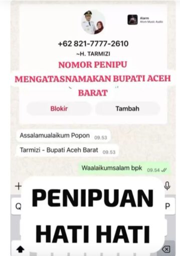 MEULABOH – Masyarakat Aceh Barat dihebohkan dengan beredarnya nomor telepon 082177772610 yang mengaku sebagai Bupati Aceh Barat, Tarmizi, SP, MM. Nomor tersebut diduga mencoba mengelabui warga dengan meminta sejumlah uang.
