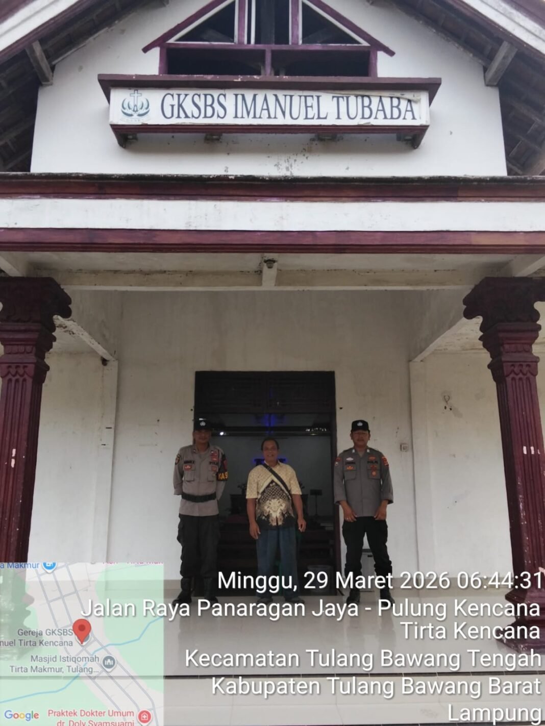 Tulang Bawang Barat I Mediaistana.com – Dalam rangka menciptakan rasa aman dan nyaman bagi umat Kristiani dan Sebagai bentuk kepedulian terhadap kenyamanan dan keamanan umat beragama Polsek Tulang Bawang Tengah, Polres Tulang Bawang Barat menggelar Patroli Minggu Kasih di Gereja Kristen Sumatera Bagian Selatan (GKSBS) Imanuel Tiyuh Tirta Makmur, Kec. Tulang Bawang Tengah Kab. Tulang Bawang Barat, Minggu (29/3/2026) Pagi