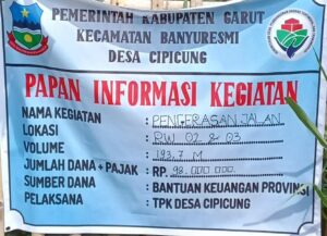 Menurut Kepala Desa Cipicung Uban Setiawan menjelaskan, Pemerintah Desa Cipicung selesai melaksanakan rehab jalan yang rusak dengan hotmix sepanjang 193,7 M dengan menyerap anggaran Bantuan Provinsi sebesar Rp.98 juta.