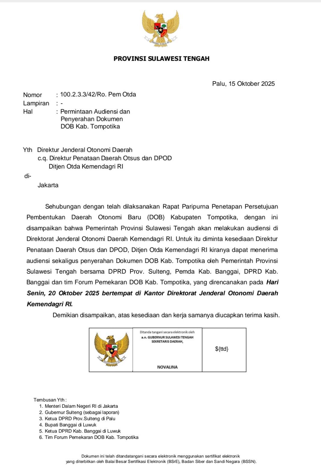 > “Sehubungan dengan telah dilaksanakannya Rapat Paripurna Penetapan Persetujuan Pembentukan Daerah Otonomi Baru (DOB) Kabupaten Tompotika, Pemerintah Provinsi Sulawesi Tengah akan melakukan audiensi sekaligus penyerahan dokumen DOB Kabupaten Tompotika,” tulis Novalina dalam surat tersebut.