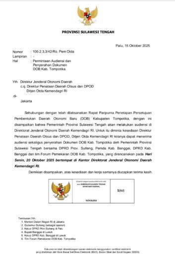Rencana audiensi tersebut tertuang dalam surat resmi bernomor 100.2.3.3/42/Ro. Pem Otda yang ditandatangani secara elektronik oleh Sekretaris Daerah Provinsi Sulawesi Tengah, Novalina, atas nama Gubernur Sulawesi Tengah.