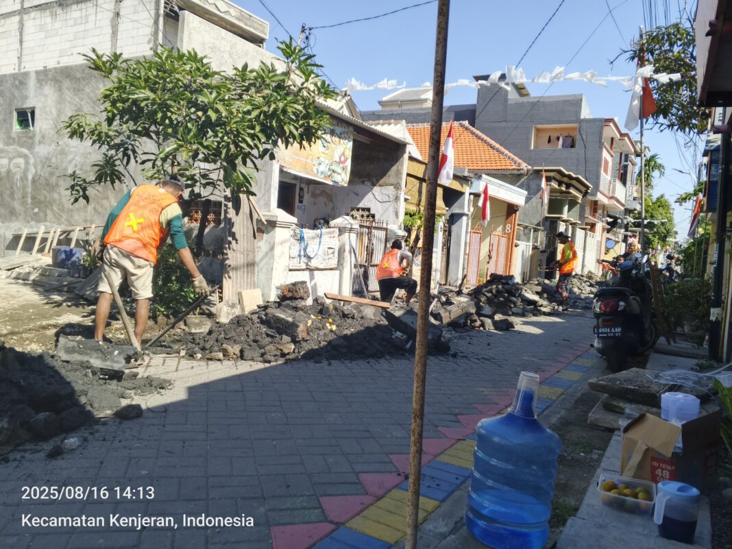 Surabaya – Sejumlah pekerja berseragam oranye terlihat sibuk membongkar jalan dan memperbaiki gorong-gorong di salah satu pemukiman warga Kecamatan Kenjeran, Sabtu (16/8/2025). Pekerjaan ini dilakukan untuk memperkuat saluran bawah tanah yang sudah lama mengalami kerusakan.