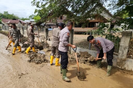 Dalam kegiatan ini, Polres Pidie menurunkan personel yang dibekali peralatan manual seperti cangkul dan sekop untuk membersihkan lumpur serta material yang menutupi jalan maupun saluran air di sepanjang ruas tersebut.