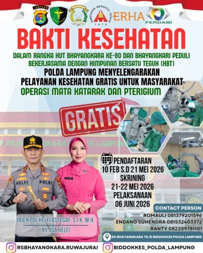 “Melalui bakti kesehatan ini, Polda Lampung ingin memberikan akses layanan operasi mata secara gratis kepada masyarakat yang membutuhkan, sebagai wujud pengabdian Polri dalam momentum Hari Bhayangkara,” ujarnya, Kamis (9/4/2026).