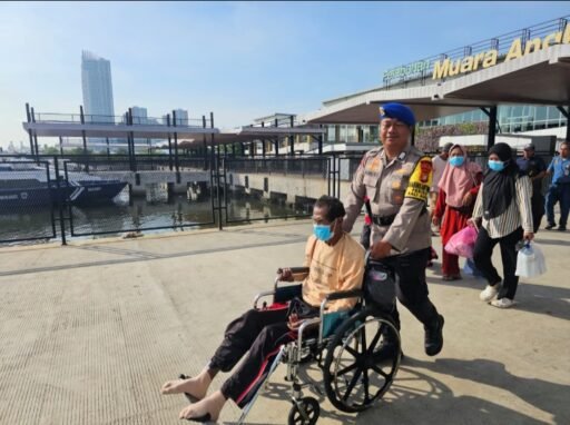 Jakarta,Mediaistana.Com – Personel Ditpolairud Polda Metro Jaya membantu penumpang berkebutuhan khusus saat proses penyeberangan di Dermaga Kali Adem, Muara Angke, Jakarta Utara, Sabtu (11/4/2026). Aksi humanis ini terlihat saat petugas mendorong kursi roda penumpang untuk memastikan proses naik turun kapal berjalan aman dan lancar.