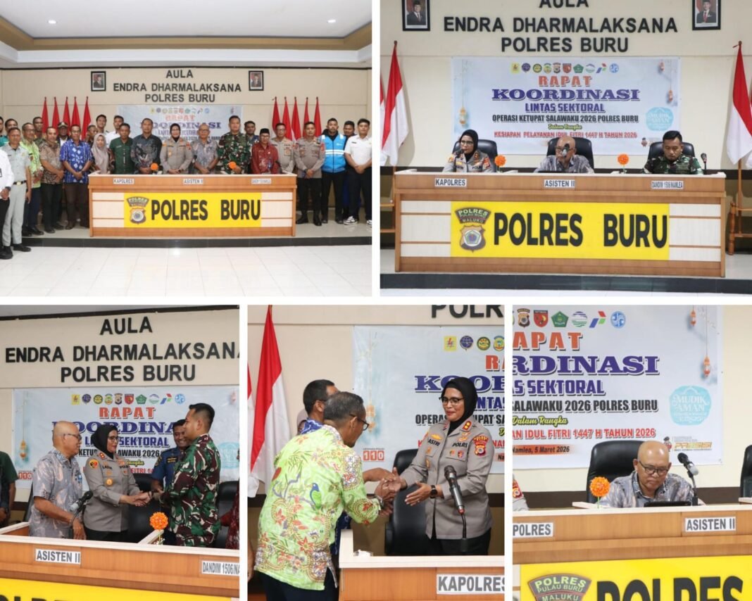 Buru – Dalam rangka memastikan kesiapan pengamanan Hari Raya Idul Fitri 1447 H, Polres Buru menggelar Rapat Koordinasi (Rakor) Lintas Sektoral Operasi Ketupat Salawaku Tahun 2026, yang berlangsung di Aula Endra Dharmalaksana Polres Buru, Kamis (5/3/2026).