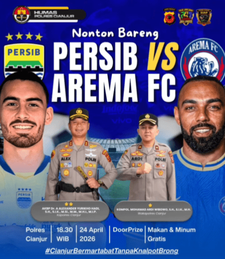 Cianjur, 24 April 2026 – Polres Cianjur mengundang seluruh masyarakat untuk turut serta dalam kegiatan nonton bareng (nobar) pertandingan sepak bola antara Persib Bandung vs Arema FC yang akan digelar pada:
