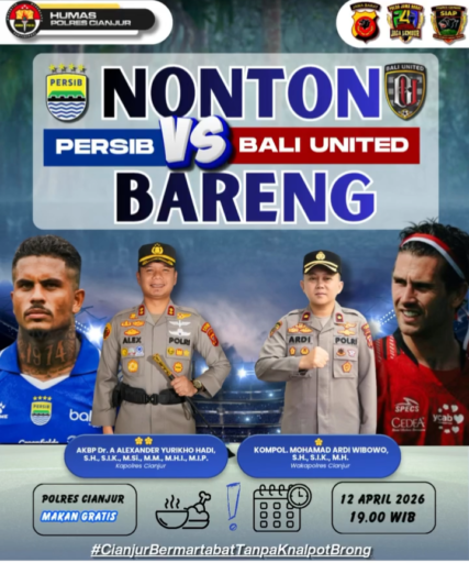 Cianjur, 12 April 2026 – Polres Cianjur menggelar kegiatan Nonton Bareng (Nobar) pertandingan Persib Bandung melawan Bali United pada Minggu (12/4/2026) pukul 19.00 WIB di Mapolres Cianjur. Kegiatan ini terbuka untuk masyarakat, khususnya Bobotoh, sebagai bentuk dukungan terhadap tim kebanggaan Jawa Barat sekaligus ajang mempererat kebersamaan.