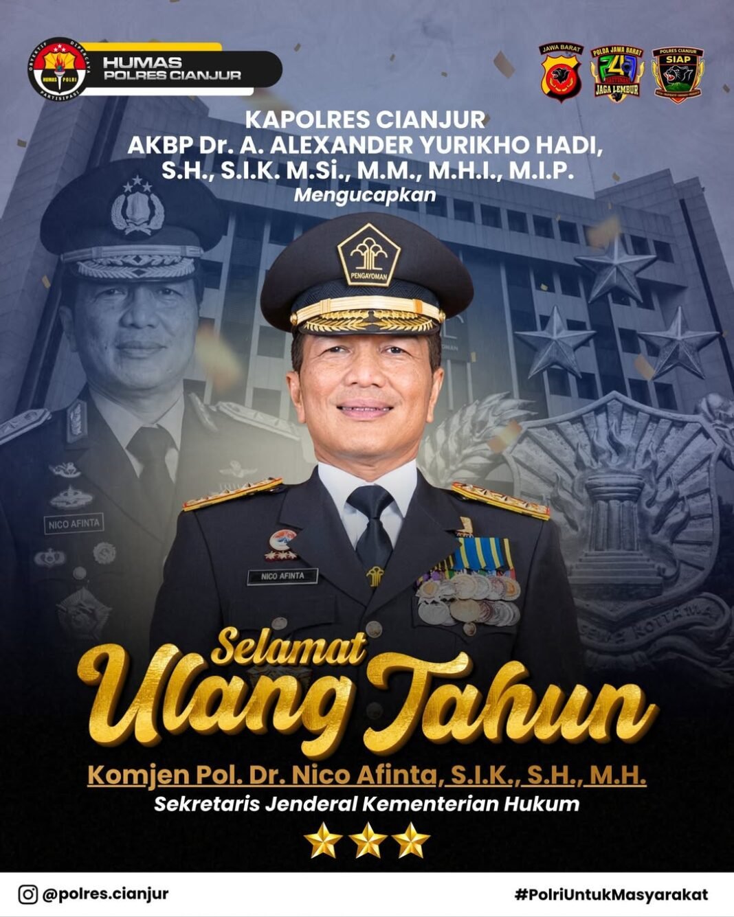 Cianjur, 30 April 2026 – Kapolres Cianjur AKBP Dr. A. Alexander Yurikho Hadi, S.H., S.I.K., M.Si., M.M., M.H.I., M.I.P., beserta seluruh jajaran Polres Cianjur menyampaikan ucapan selamat ulang tahun kepada Komjen Pol. Dr. Nico Afinta, S.I.K., S.H., M.H., yang saat ini menjabat sebagai Sekretaris Jenderal Kementerian Hukum.