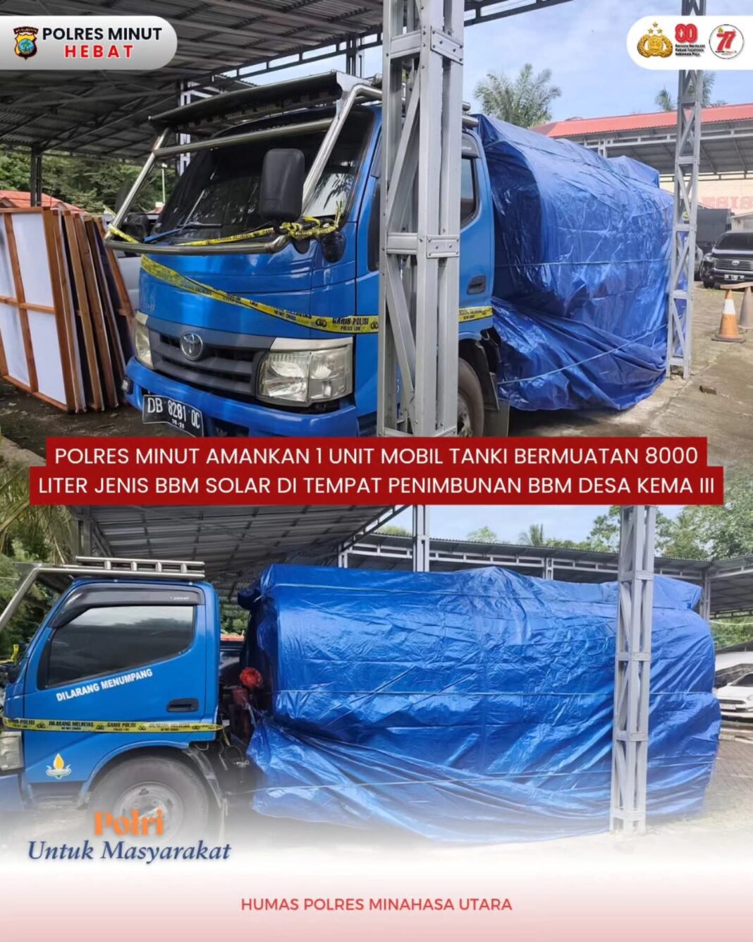 Minahasa Utara,Mediaistana.com –Polres Minahasa Utara (Minut) mengamankan 1 unit mobil tanki bermuatan BBM jenis solar sebanyak 8000 liter, yang diduga menjadi tempat penimbunan BBM jenis solar, di Desa Kema III Kecamatan Kema Kabupaten Minut.