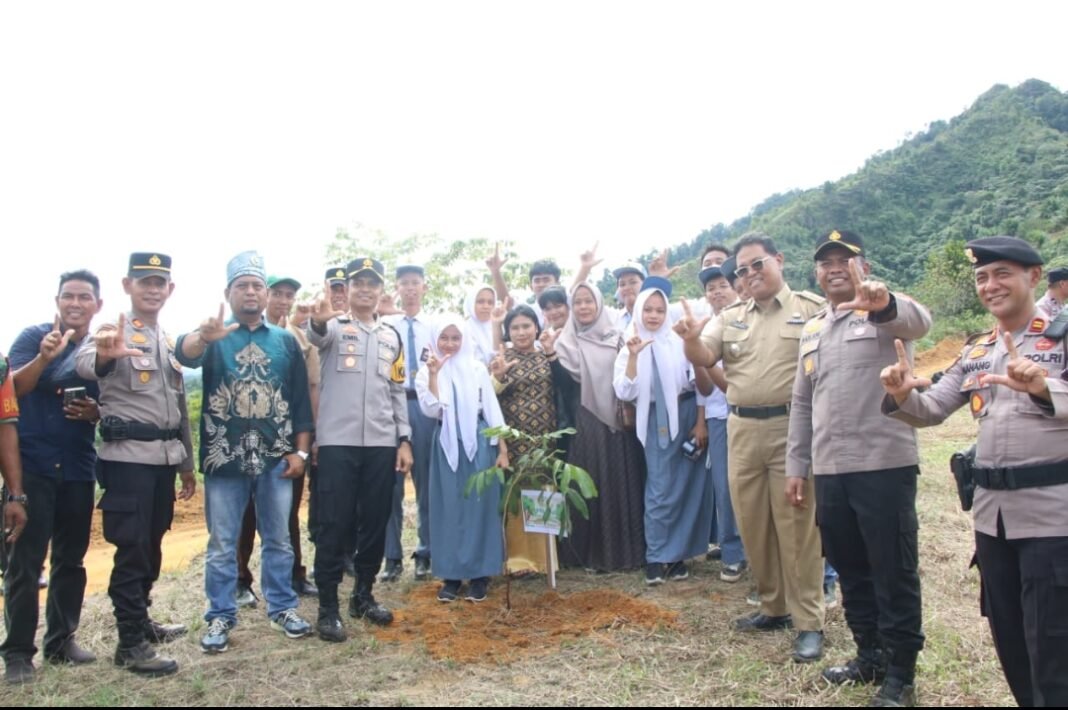 Polres Rokan Hulu turut menyerahkan bibit pohon kepada perwakilan Camat Kabun dan tokoh adat Desa Aliantan, Dt. Mejendo, sebagai simbol kolaborasi menjaga kelestarian alam.