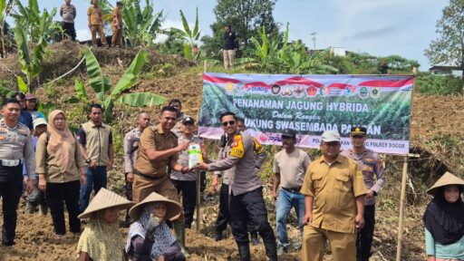 Dalam rangka mendukung program ketahanan pangan nasional, Polsek Babakan Madang Polres Bogor menggelar kegiatan seremonial penanaman jagung hibrida di lahan pertanian Desa Bojong Koneng, Kecamatan Babakan Madang, Kabupaten Bogor, pada Senin (27/10/2025).
