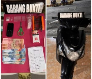 Selain narkotika, petugas juga mengamankan sejumlah barang bukti lain berupa plastik klip kosong, pipet berbentuk sekop, dompet, gunting, uang tunai sebesar Rp614.000, buku catatan hutang pembelian sabu, satu unit handphone, serta satu unit sepeda motor. Total berat bruto narkotika jenis sabu yang diamankan mencapai 1,28 gram.