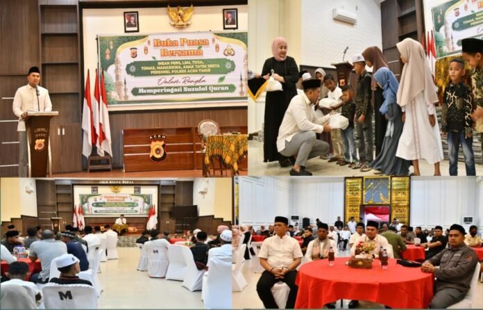 Suasana kebersamaan mewarnai kegiatan buka puasa bersama yang digelar Polres Aceh Timur bersama insan pers, tokoh agama, tokoh masyarakat, organisasi kemasyarakatan, mahasiswa, serta anak yatim piatu, Selasa (10/03/2025) petang.