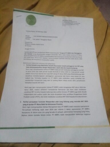 Point berikutnya mengenai tuntutan Masyarakat Adat Long Duhung yang menolak RKT 2025 yang di ajukan PT WBPU ke kehutanan Provinsi, menyampaikan ke Media Istana bahwa manajemen baru PT WBPU telah memulai operasional terhitung sejak awal 2024. Selama 2 tahun operasional, PT WBPU beroperasi di dalam area izin yang berada di wilayah administrasi Kampung Long Pelay.