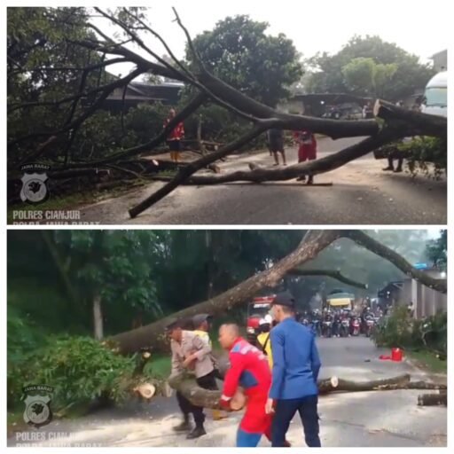 Cianjur, 30 April 2026 – Personel Polsek Cikalongkulon Polres Cianjur bergerak cepat menindaklanjuti laporan masyarakat melalui layanan 110 terkait kejadian pohon tumbang yang menutup badan jalan di Kampung Tanjakan Kemang, Desa Mentengsari, Kecamatan Cikalongkulon, Kabupaten Cianjur, Kamis (30/4/2026).