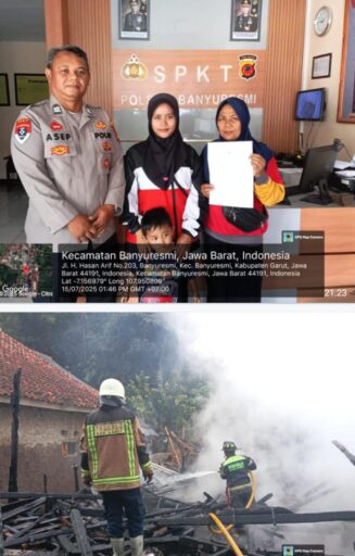 Garut – mediaistana.com,. Korban kebakaran rumah, miliki Hermin (Seorang janda), didampingi Anggota Polsek Banyuresmi Aiptu Asep Ruspandi, anak ke 4 (Delisa) dan cucunya (Husein) yang telah yatim, membuat laporan ke Polsek Banyuresmi, Kecamatan Banyuresmi, Kabupaten Garut. Selasa, 15 Juli 2025.