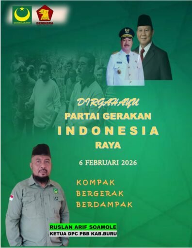 Atas nama pribadi dan keluarga besar Partai Bulan Bintang Kabupaten Buru, Ruslan Arif Soamole menyampaikan ucapan selamat ulang tahun ke-18 kepada Partai Gerindra. Semoga di usia yang semakin dewasa ini, Partai Gerindra senantiasa diberi kekuatan, kebijaksanaan, dan keteguhan untuk terus mengabdi kepada rakyat, menjaga persatuan, serta menjadi pilar demokrasi yang bermartabat.