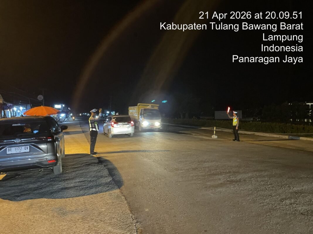 Tulang Bawang Barat l Mediaistana.com – Guna menciptakan keamanan dan rasa nyaman di tengah masyarakat, khususnya pengguna jalan yang melintas di malam hari, Sat lantas Polres Tulang Bawang Barat, Polda Lampung melaksanakan pam rawan malam patroli blue light di Jalan Raya Islamik Center kec Tulang Bawang Tengah Kab. Tulang Bawang Barat. Selasa (21/04/2026) malam